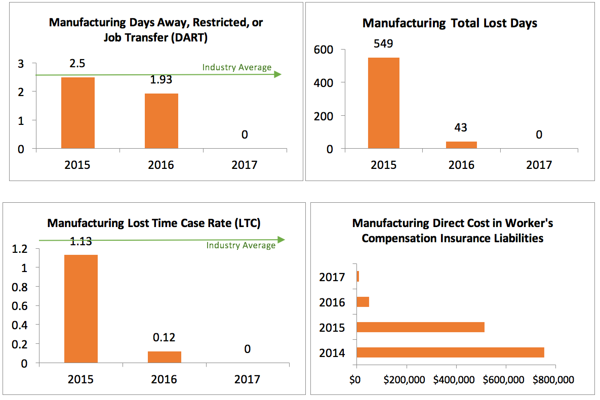 [Industrial Averages noted as TRIR, DART, and LTC in the charts below are OSHA trending numbers based on 200,000 work hours and are based on the North American Industrial Classification Code (NAICS) 332420].