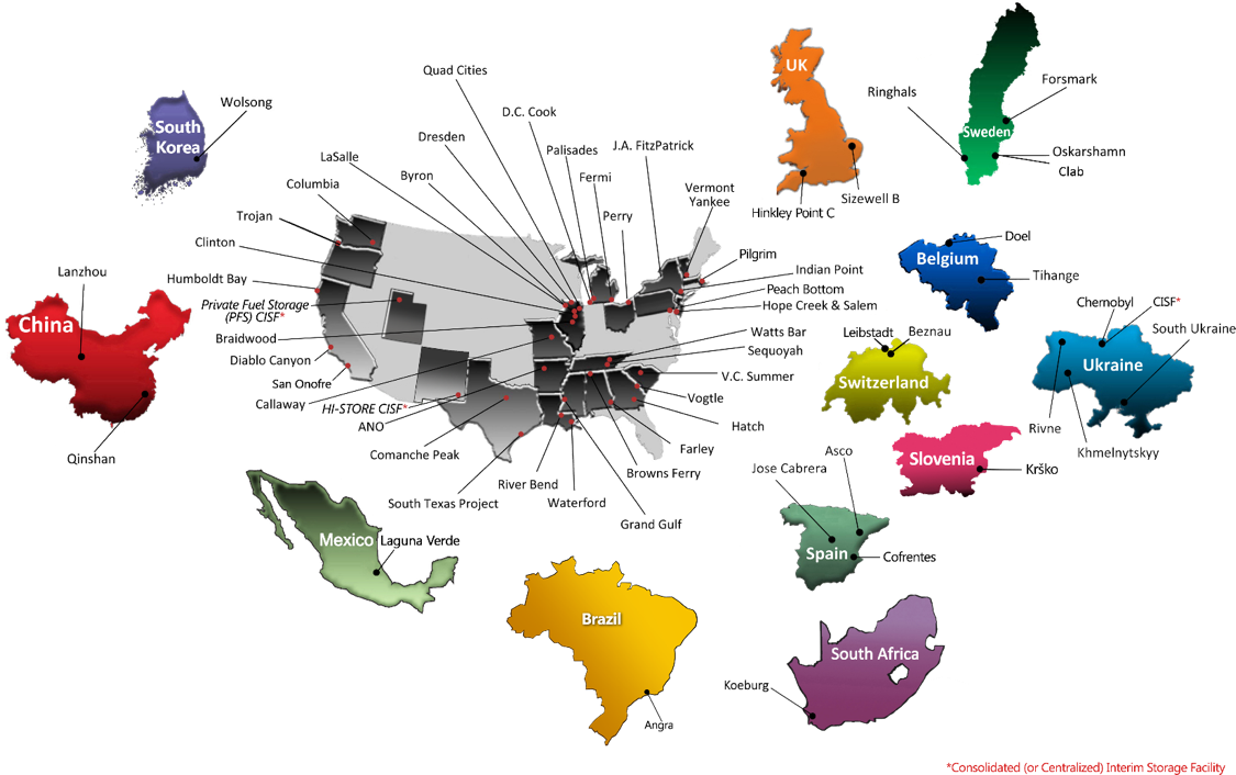 We are pleased to welcome Brazil’s Angra 1 & 2 and Spain’s Cofrentes nuclear power plants to our ranks of international clients who have selected Holtec’s technology through rigorous international tendering processes. The map below shows an updated list of sites deploying Holtec’s dry storage and transport technologies and services, now spanning five continents.