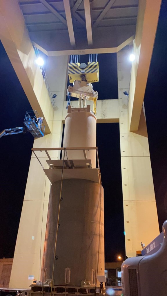 We are pleased to hail the arrival of the multi-purpose canister (MPCs) technology, originally espoused by the USDOE in the early 1990s as the most robust fuel packaging solution and embraced universally by the US nuclear plants, on the South American continent. Having led the first licensing and deployment of MPCs in the US in the late 1990s with an overwhelming market share in the US and many stalwart nuclear countries such as the UK, Spain, Mexico, Slovenia, and Ukraine, we now have the honor to welcome Eletronuclear of Brazil to our roster of distinguished users of the HI-STORM FW vertical ventilated overpack technology. The first HI-STORM FW system containing MPC-32ML which features a specially designed and licensed Metamic-HT™ fuel basket optimized for the unique Angra 2 fuel was successfully loaded in a HI-STORM FW system and placed onto the Complementary Dry Storage Unit for Spent Fuel (UAS) [called an ISFSI in the USA] on March 22nd, marking the official start of its planned 50 years of operation. The UAS was designed and licensed as a standalone nuclear installation according to CNEN 1.04, with supplemental directives for compliance with USNRC RG-3.2 and NUREG-1567. The UAS includes physical security, radiation and temperature monitoring, an armored access control center, and a storage warehouse with a technical workshop, designed and constructed by Holtec International. This event also marks the first use of Holtec’s HI-TRAN 300, a single-failure proof vertical heavy load hauler that was designed and manufactured at Holtec’s Advanced Manufacturing Division in Camden, New Jersey.