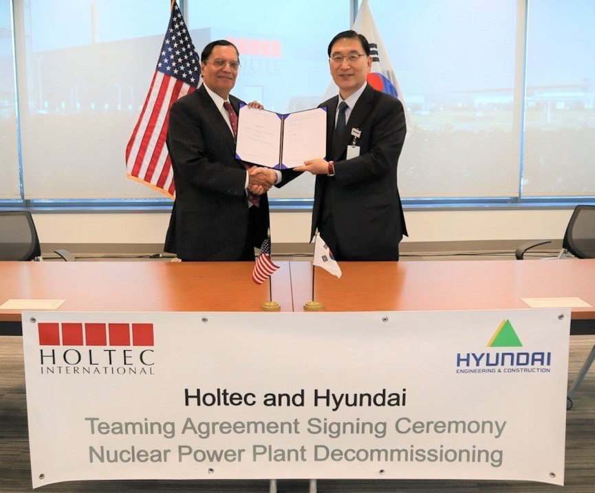 We are pleased to announce that Holtec International and Hyundai Engineering & Construction (HDEC) have signed an agreement to cooperate in the area of nuclear plant decommissioning. As part of the agreement, HDEC will participate in decommissioning activities at Holtec-owned decommissioning sites in the United States to build their capabilities and experience in preparation for decommissioning projects in South Korea, which will be undertaken by the two companies. The agreement also provides for the two companies to further expand their cooperation internationally.