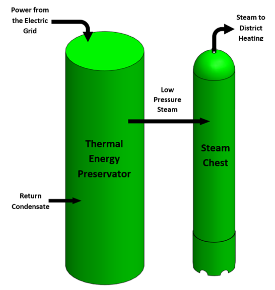 Because there is no limit on the number of systems that can be deployed in parallel at any site, there is no limit on the supply of steam available for district heating or any other application. As illustrated schematically on this page, the HI-HEAT system consists of two modules called the Preservator and the Steam Chest. The Preservator is designed to preserve the stored heat losing only 8% after a month in the standby mode. The Steam Chest is a smaller insulated vessel which serves to maintain an inventory of steam to stabilize the supply system. The HI-HEAT system has no moving parts or life-limiting constituents and thus should be reasonably expected to serve satisfactorily for many, many decades. Unlike Lithium-ion batteries, the decommissioning of the HI-HEAT system will involve no disposal of hazardous materials.