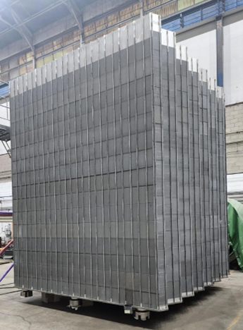 The completed modules, one module pictured on this page, co-produced by Holtec Asia and its parent Holtec International, will be installed in a freestanding configuration in a new wet storage facility being built at the KKNPP site. The hexagonal cross section of the VVER-1000 fuel differentiates from Western Pressurized Water Reactors (PWRs) which are of square cross section.