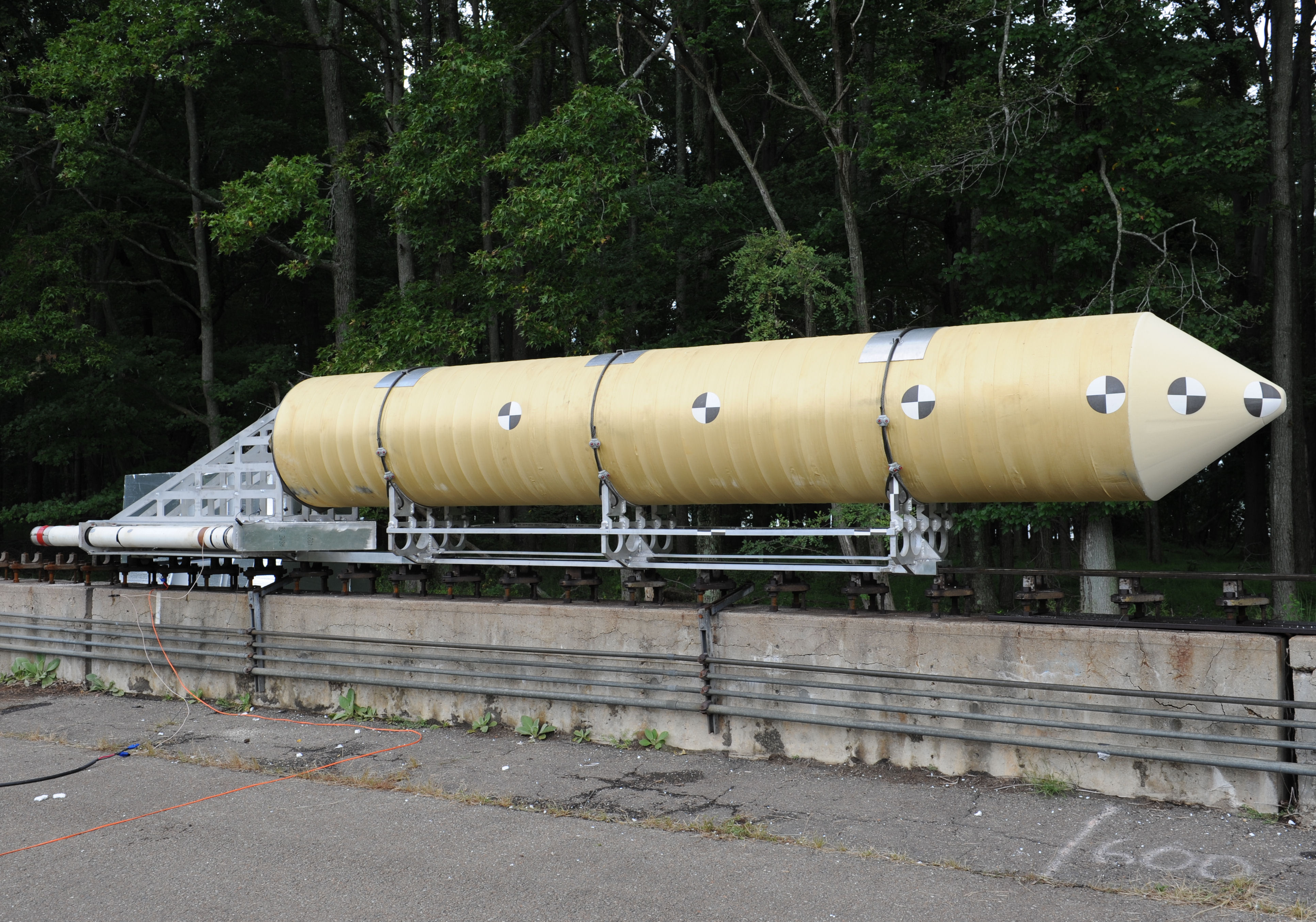 August 29, 2013, U.S. Army’s Aberdeen Proving Grounds: As engineers from Axpo Power AG (Holtec’s client), the Swiss Federal Nuclear Safety Inspectorate (ENSI), the Swiss Association for Technical Inspections (SVTI) and Holtec watched, the U.S. Army’s missile launcher delivered a picture perfect strike to a scaled model of the HI-STAR 180 transport cask, sending it tumbling into a catch box just as intended by our test engineers. In accordance with the Swiss regulator’s storage certification requirement, this missile test was designed to simulate the impact of a crashing aircraft on the HI-STAR 180 transport cask while in use as a spent fuel storage device. The missile was designed by Holtec’s engineers to deliver the “design basis impulse” using LS-DYNA. Calibration of the missile’s kinetic performance was calibrated over a year ago at the Aberdeen facility by hurling the missile against a “rigid” wall serving as the target. The data collected from the cask test showed that the missile struck the cask at a velocity exceeding 600 miles per hour which was over 17% greater than the target value and the location of impact was precisely that determined to impart the maximum stress levels on the containment boundary and to conservatively challenge the cask containment (to induce leakage of the cask’s contents) by parametric simulations on LS- DYNA.
